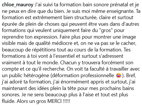 "Jessica a su poser les bases des bains sonores dans un premier temps puis a su orienter la formation vers les femmes enceintes. Jessica est toujours aussi passionnée et passionnante. J'ai appris énormément de choses. J'avais réalisé en présentiel la formation bains sonores individuel et collectif mais il est vrai que les femmes enceintes étaient un sujet assez flou pour moi. Me voilà allégée d'un poids, hâte de pouvoir mettre en pratique !"